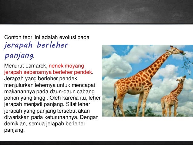 Contoh teori Lamarck adalah jerapah sekarang yang berleher panjang nenek moyangnya adalah jerapah yang berleher pendek karena sering digunakan untuk mengambil makanan di tempat yang tinggi akhirnya menjadi panjang dan sifat ini diwariskan pada keturunannya. Download makalah evolusi jerapah Comments. Jerapah-jerapah tersebut berkompetisi untuk mendapatkan makanan.