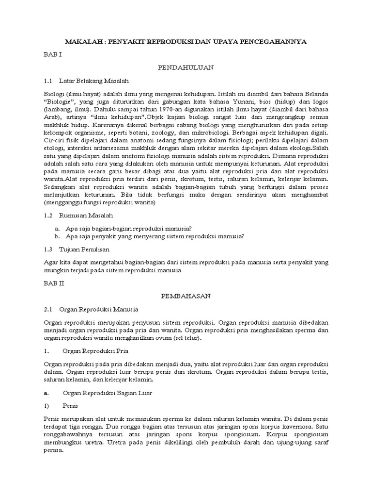 Contoh makalah penyakit pada sistem reproduksi manusia dan pencegahannya. Pada umumnya penyakit kelamin ditularkan melalui hubungan seksual. Latar Belakang Proses reproduksi pada manusia membutuhkan sperma dan ovum. Penyakit pada sistem reproduksi balannitis ini paling sering terjadi pada pria dan anak laki-laki yang belum disunat memiliki operasi kulup dihapus dan yang memiliki kebersihan yang buruk.